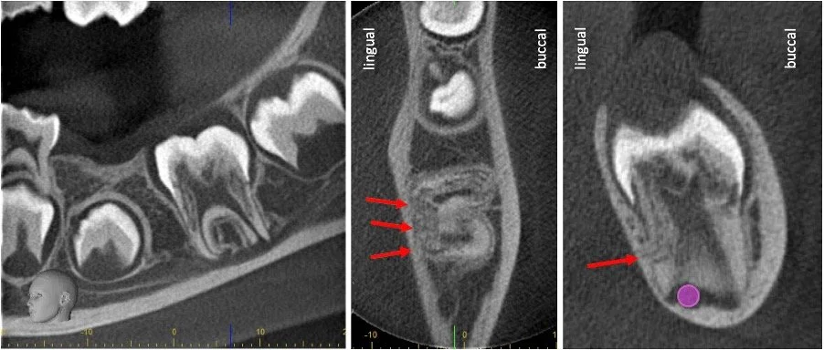 Advanced imaging (CBCT) showing extensive resorption (arrows)